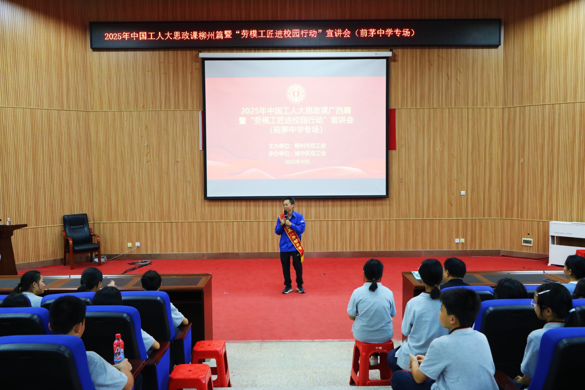 为深入学习贯彻党的二十大及中国工会十八大精神,大力弘扬劳模精神、劳动精神、工匠精神,切实加强新时代劳动教育,10月14日下午,2025年中国工人大思政课柳州篇暨“劳模工匠进校园行动”宣讲会(城中区专场)在柳州市前茅中学举行。学校450余名学生代表现场聆听宣讲,近距离感受劳模工匠的榜样力量。