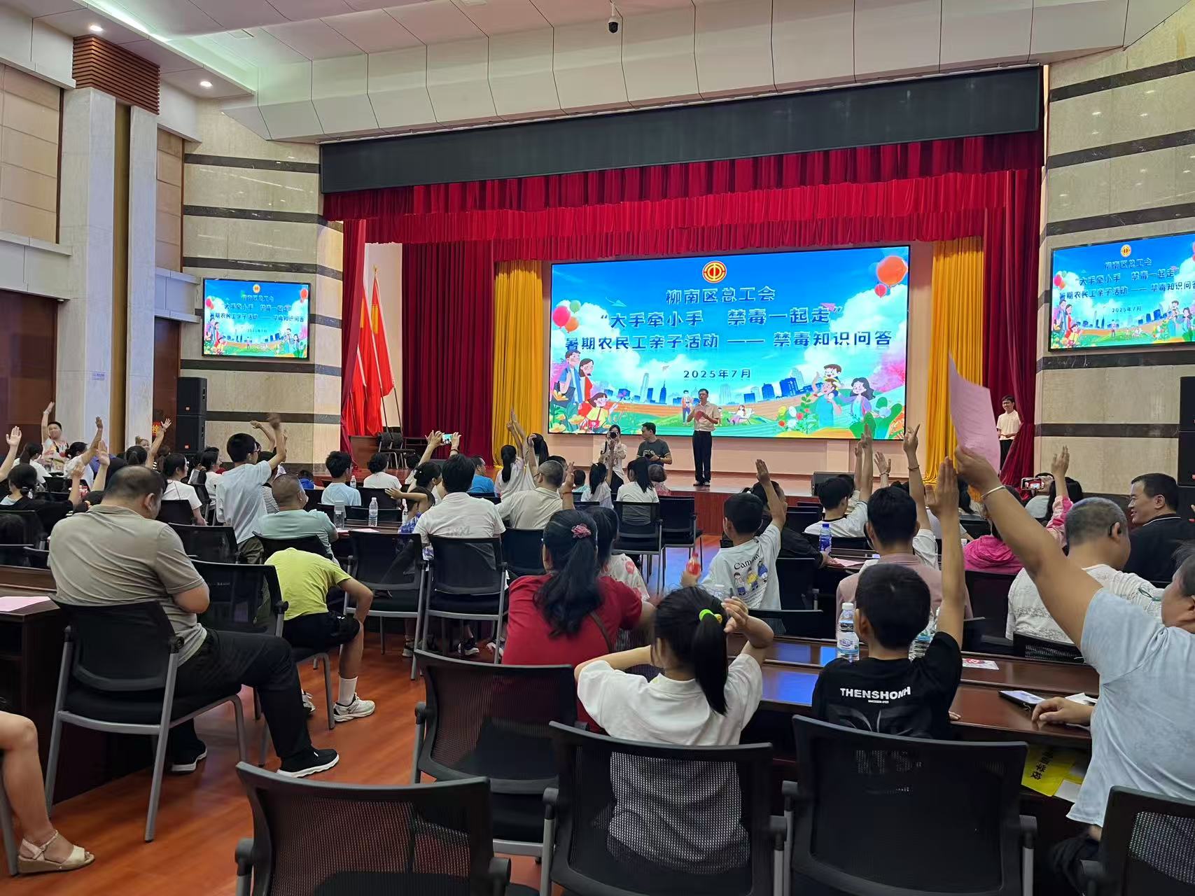 为进一步加强暑期农民工子女的禁毒教育,引导家庭树立良好家风,7月31日,柳南区总工会精心策划的“大手牵小手,禁毒一起走”暑期农民工亲子活动在柳南区绿化大楼温情开展。活动以禁毒宣传教育为核心,通过生动直观的科普视频与互动问答,让家长与孩子在温馨互动中筑牢禁毒防线。