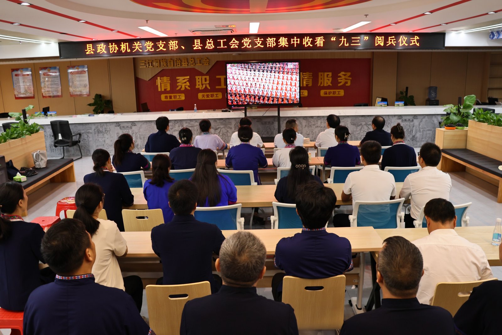 三江侗族自治县政协与县总工会集中观看“九三”阅兵仪式