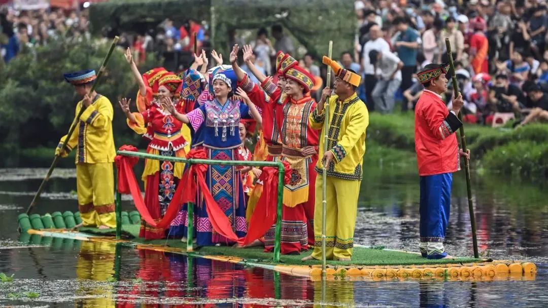 2023年4月22日,在钦北区贵台镇洞利江河面,当地群众在进行山歌对唱比赛。当日,广西钦州市在钦北区贵台镇洞利江畔举行实景演出,欢庆“三月三”传统佳节。   新华社记者 张爱林 摄
