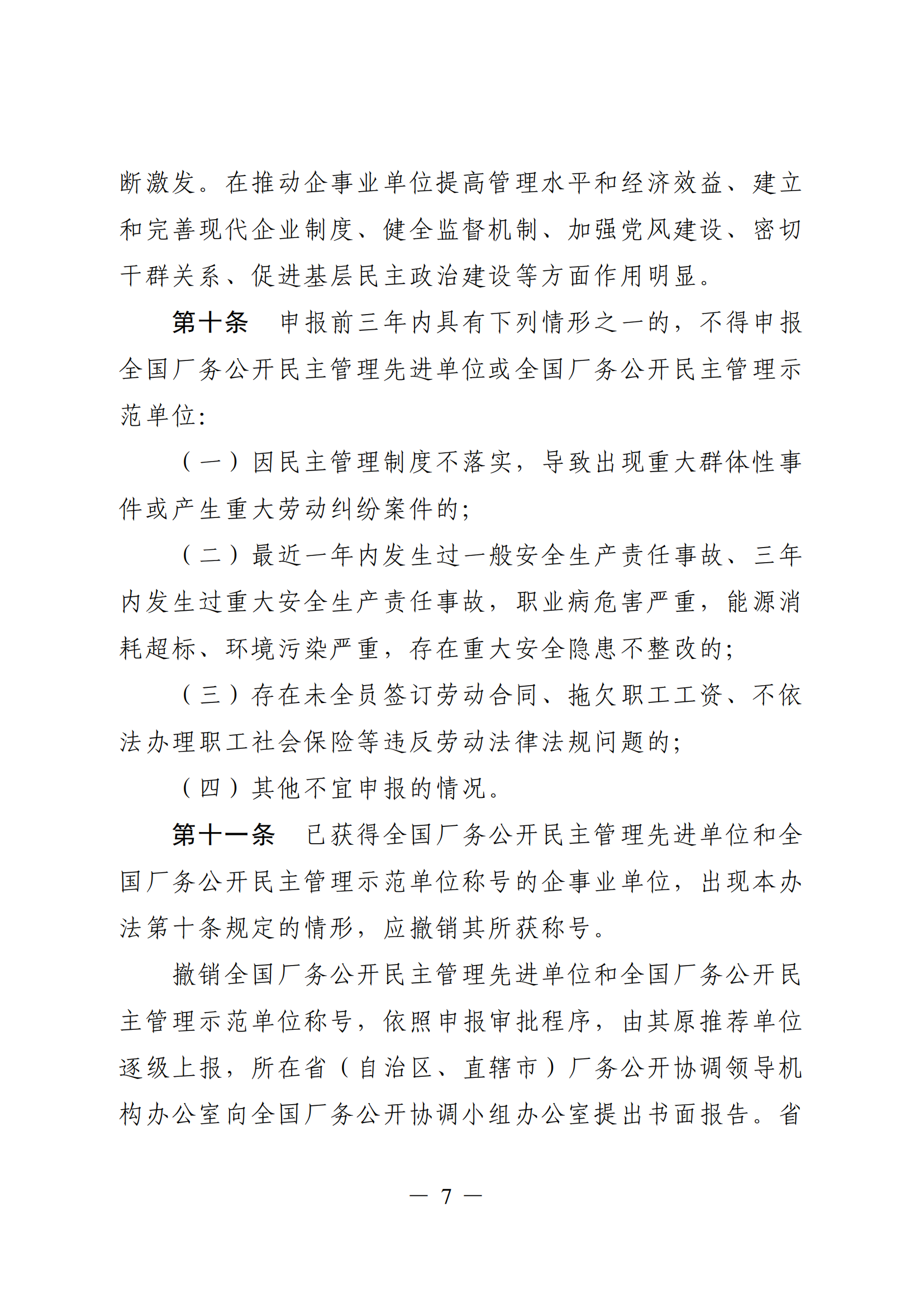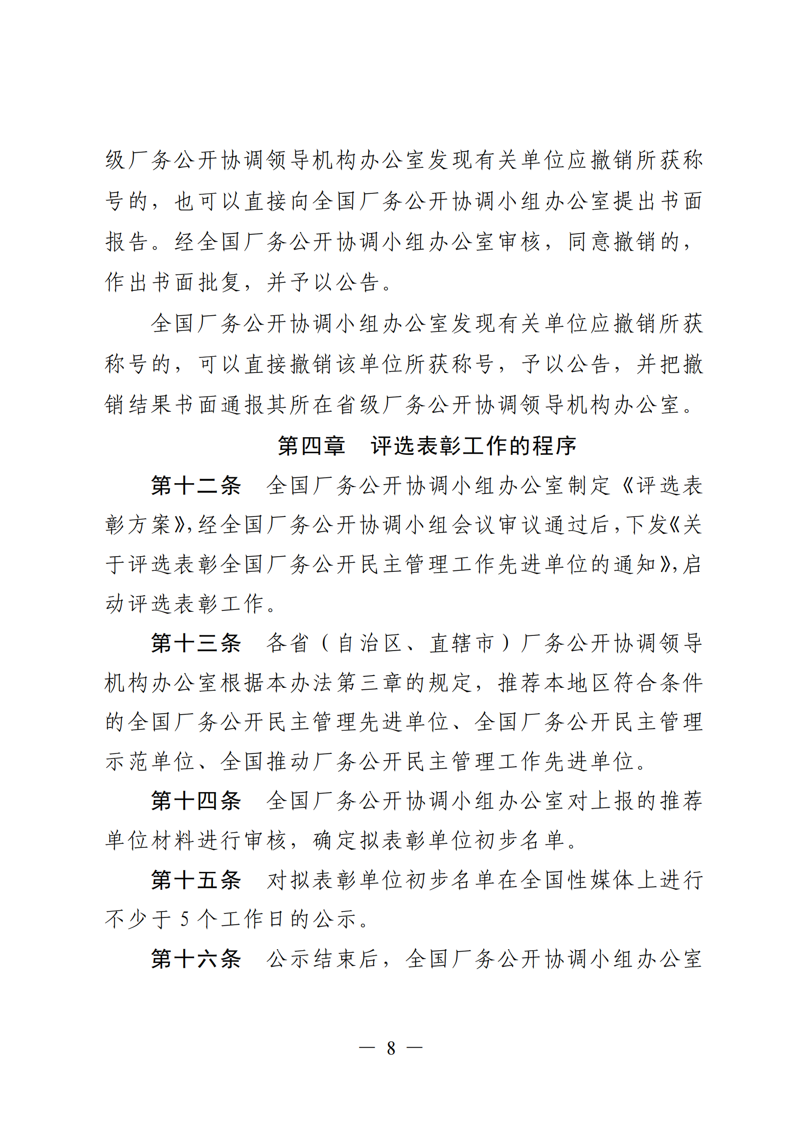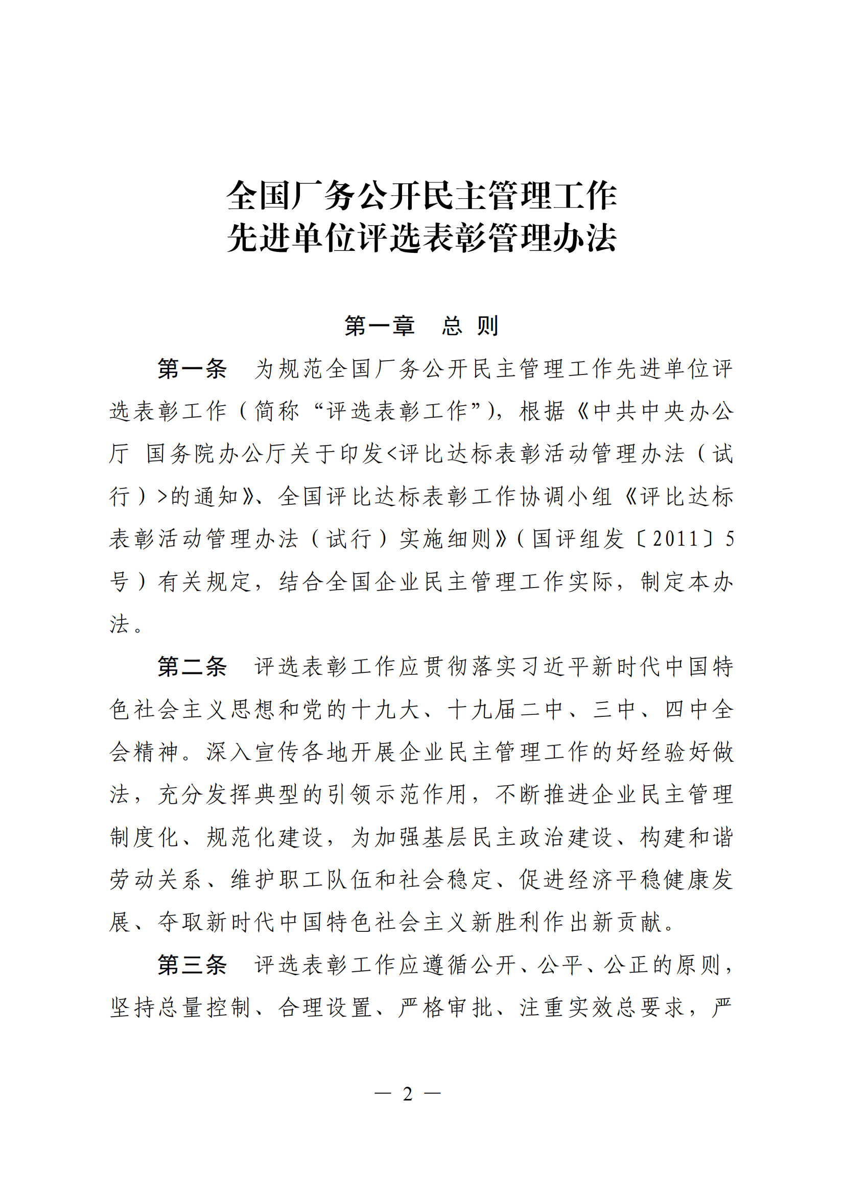全国厂务公开协调小组办公室关于印发《全国厂务公开民主管理工作先进单位全国厂务公开协调小组办公室关于印发《全国厂务公开民主管理工作先进单位 评选表彰管理办法》的通知 国厂开组办发〔2020〕4 号