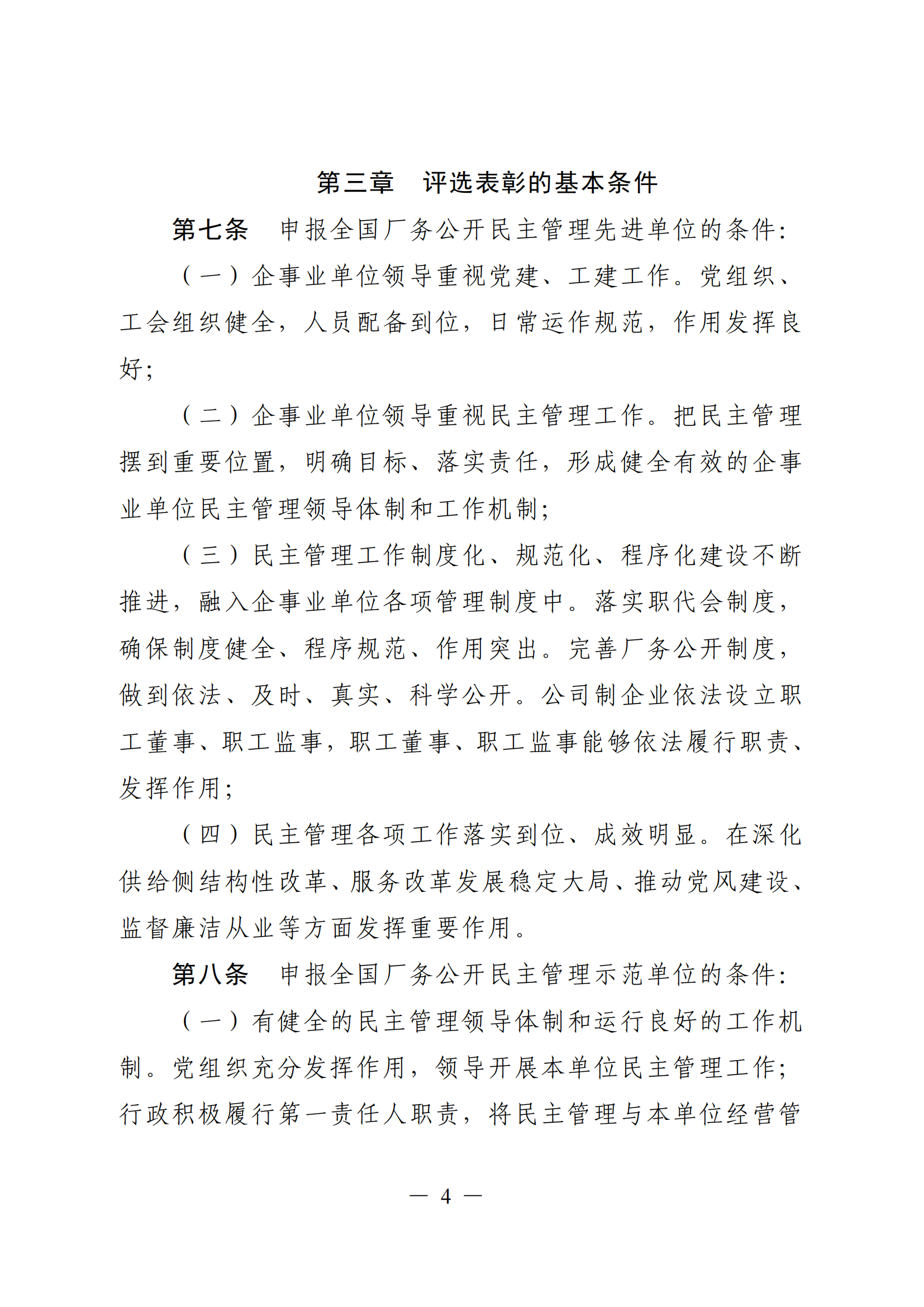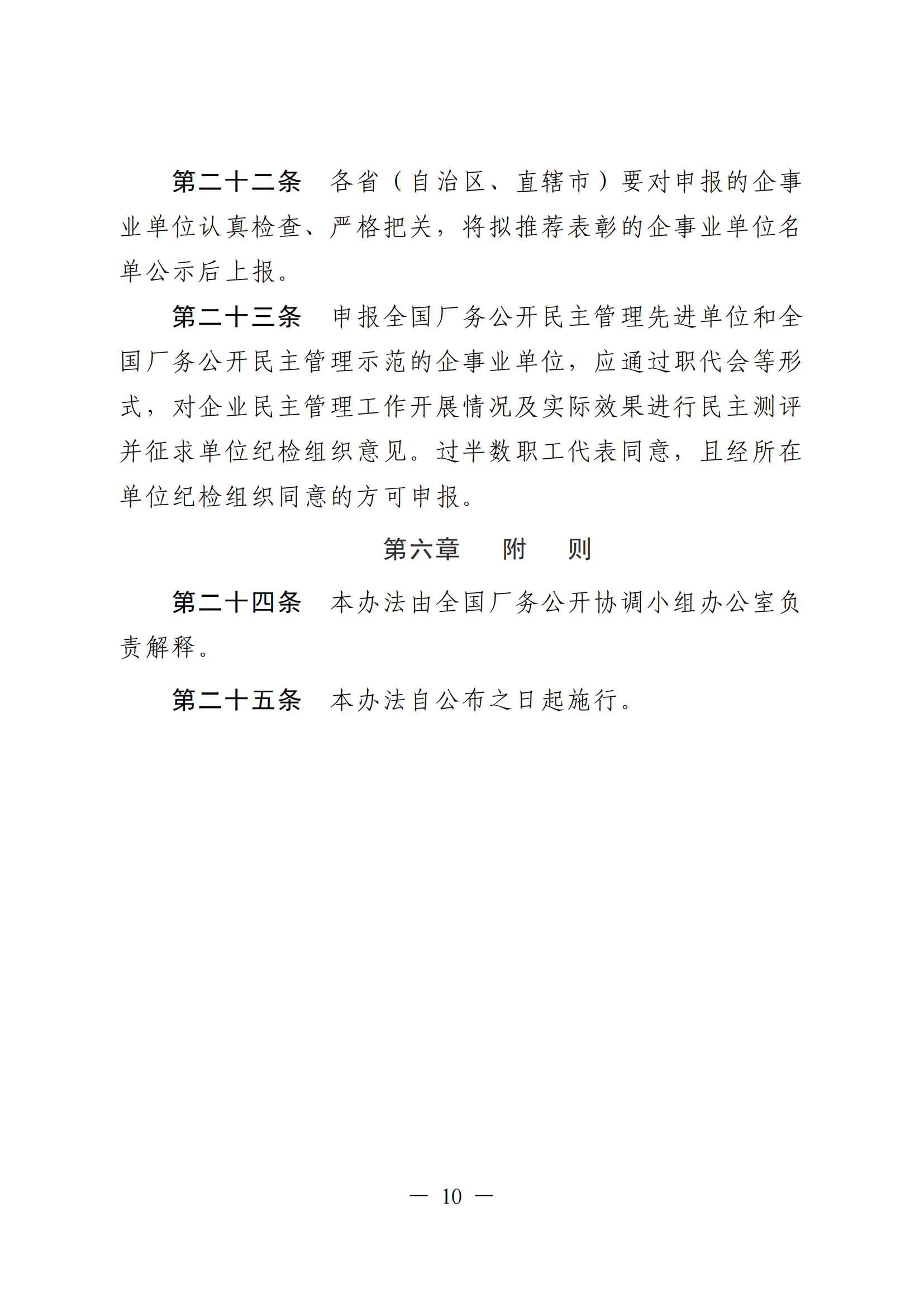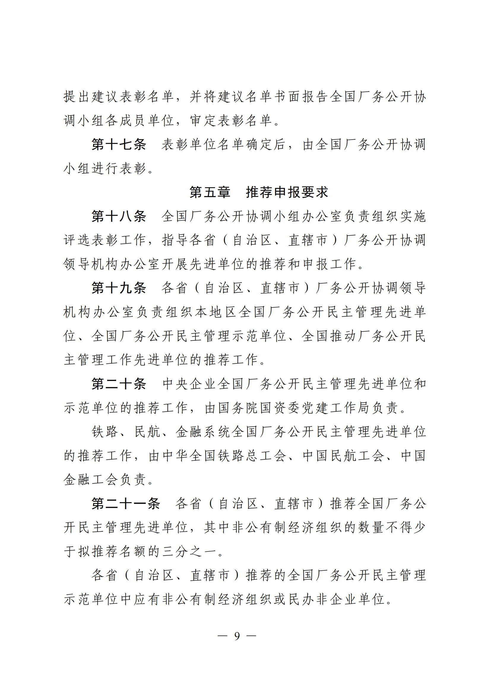 全国厂务公开协调小组办公室关于印发《全国厂务公开民主管理工作先进单位全国厂务公开协调小组办公室关于印发《全国厂务公开民主管理工作先进单位 评选表彰管理办法》的通知 国厂开组办发〔2020〕4 号