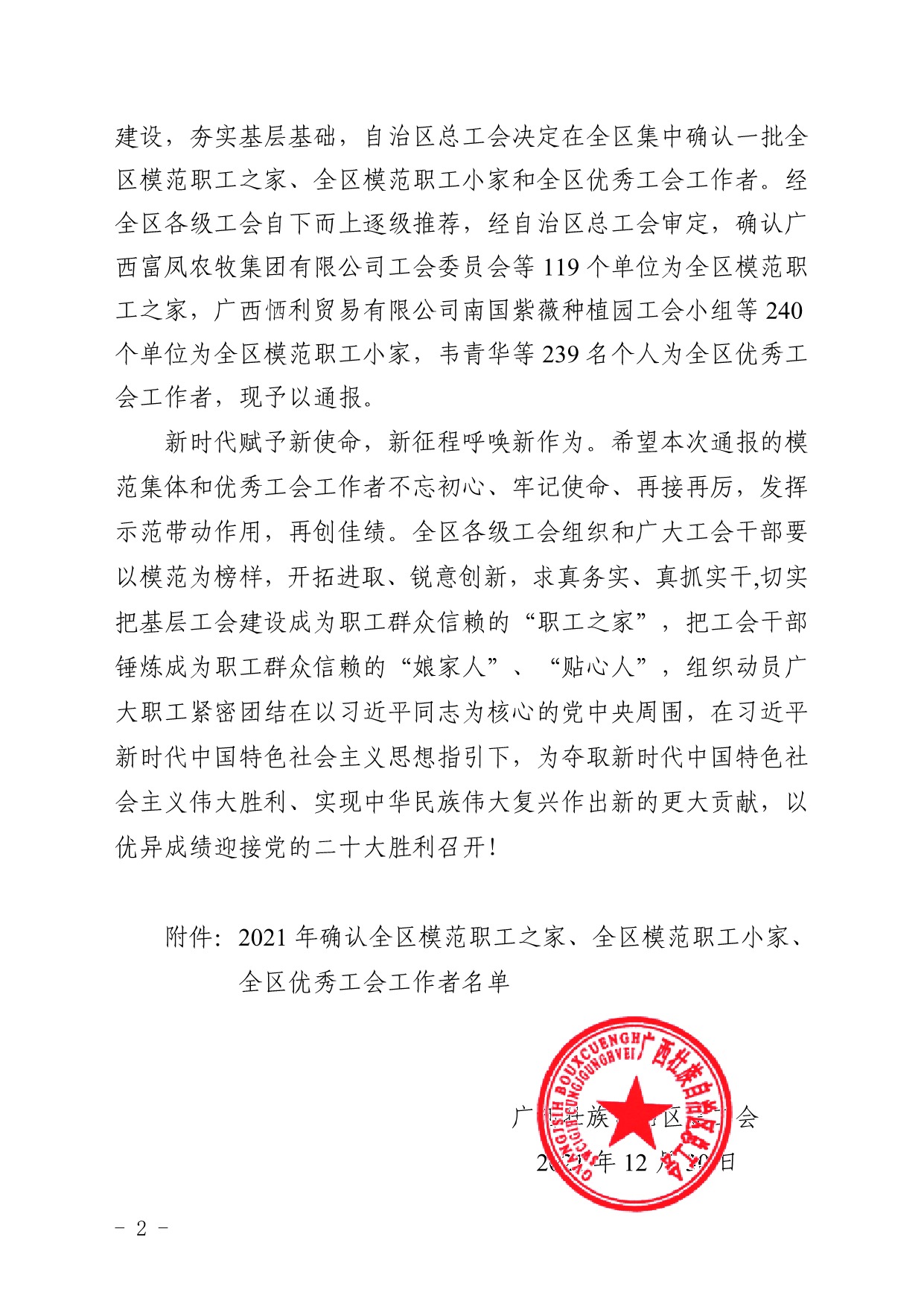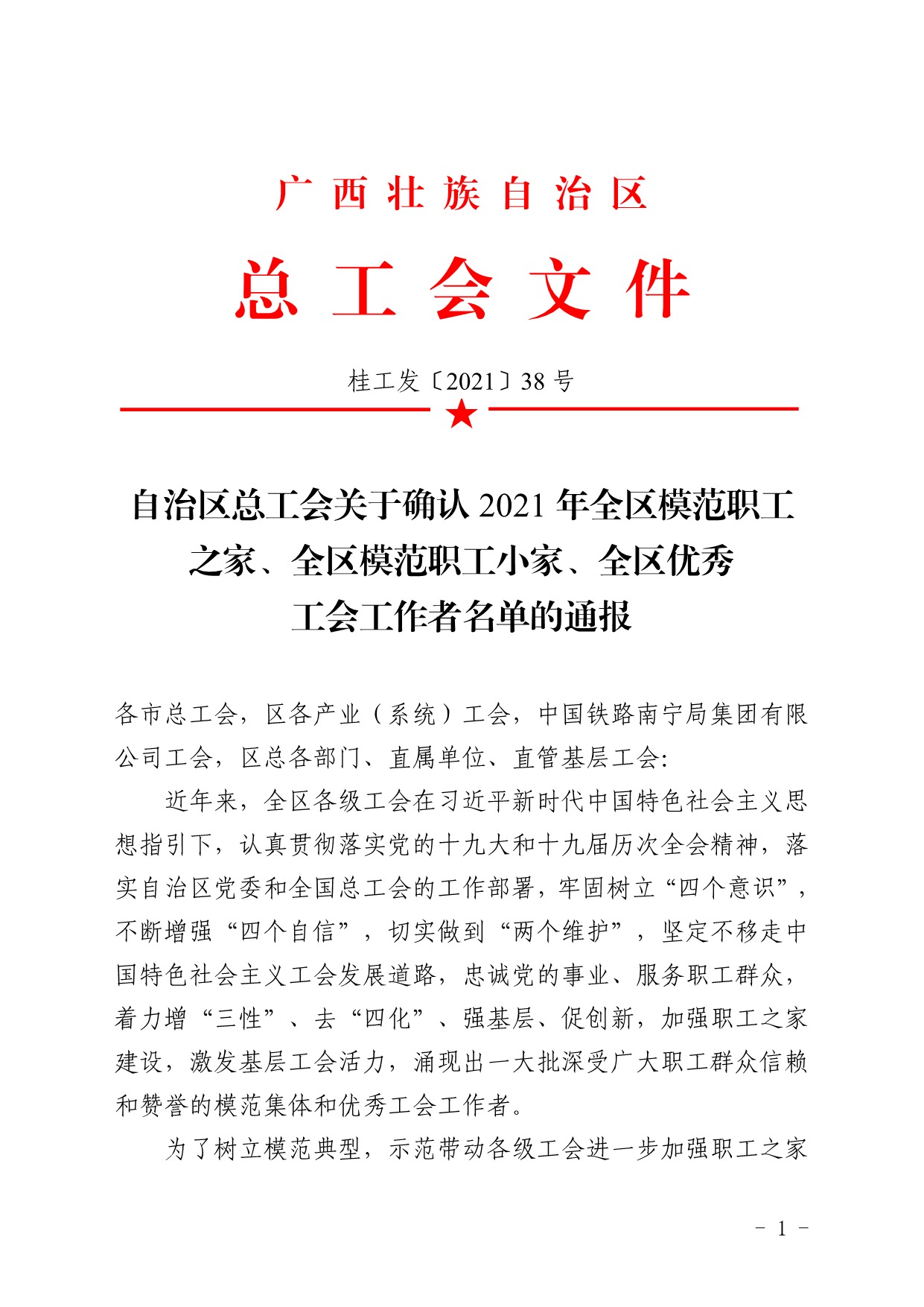 自治区总工会关于确认2021年全区模范职工之家、全区模范职工小家、全区优秀工会工作者名单的通报