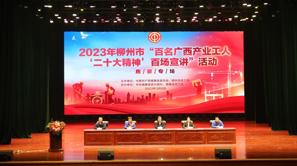 鹿寨讯 为深入学习宣传贯彻党的二十大精神,进一步推进产业工人队伍建设改革,强化全县广大职工群众思想政治引领3月9日上午,2023年柳州市“百名广西产业工人‘党的二十大精神’百场宣讲”活动(鹿寨专场)在鹿寨文化艺术中心大剧院举行。柳州市人大常委会副主任、党组副书记、市总工会主席梁日春,鹿寨县四家班子领导、县直各单位领导、企业负责人、各级劳模工匠代表、一线职工代表、学生代表等500多人到场聆听。
